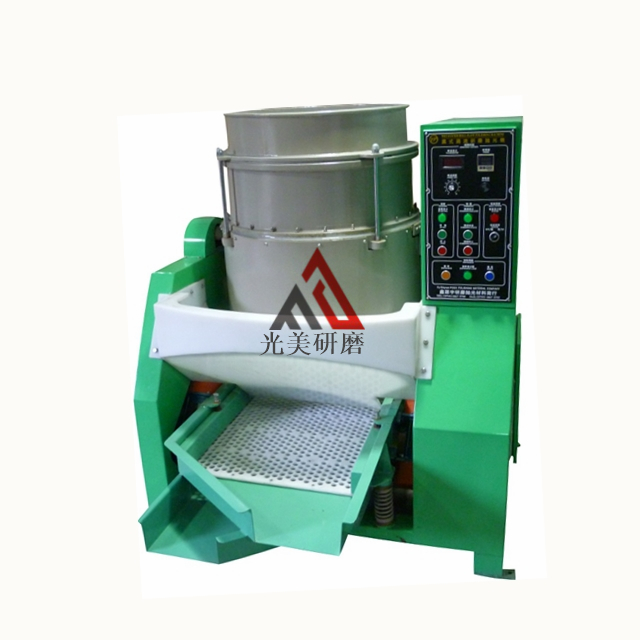 本设备由研磨盘、转动盘及驱动系统所组成.以每分钟30 - 200转高速旋转。当转动盘旋转时,研磨盘内的磨料及工件受离心力沿筒壁向上运动,然后靠零件、磨料的自重,从研磨盘高处落回到转动盘中部,如此反复,使装载物呈螺旋状不断运动,从而产生高效能的研磨。