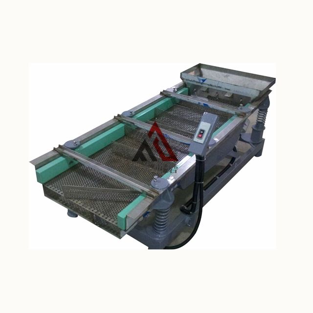 当纵向安装在筛体上的两台振动电机做相对运转时,两台振动电机两端的偏心块便产生额定激振力,其产生在横向的激振力由于电机的相对运转而相互抵消,其纵向激振力通过传振体传递到整个筛箱上,而使筛面振动,从而使筛面上的物料受其激振力而在筛网面上向出料品方向跳跃运动,小于筛孔的物料通过筛孔而落到下层,经连续跳跃后从出料口流出,由于筛分过程合理,物料经振动筛分级后,可取得几种不同粒度的物料,完成物料的分级作业。
